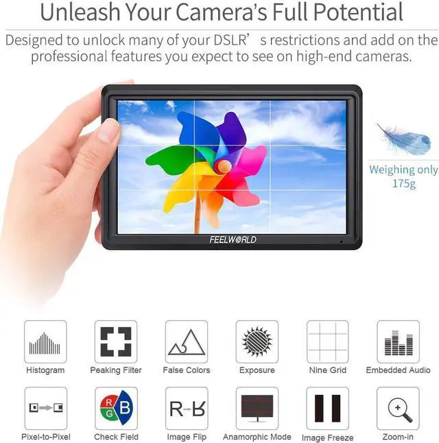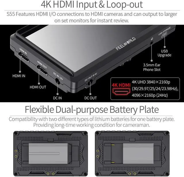 175g light-weight design: Makes great convenient for cameraman in outdoor or handheld applications. The S55 on-camera monitor's small size makes it ideal for gimbals and lightweight camera systems especially those without a built-in display.