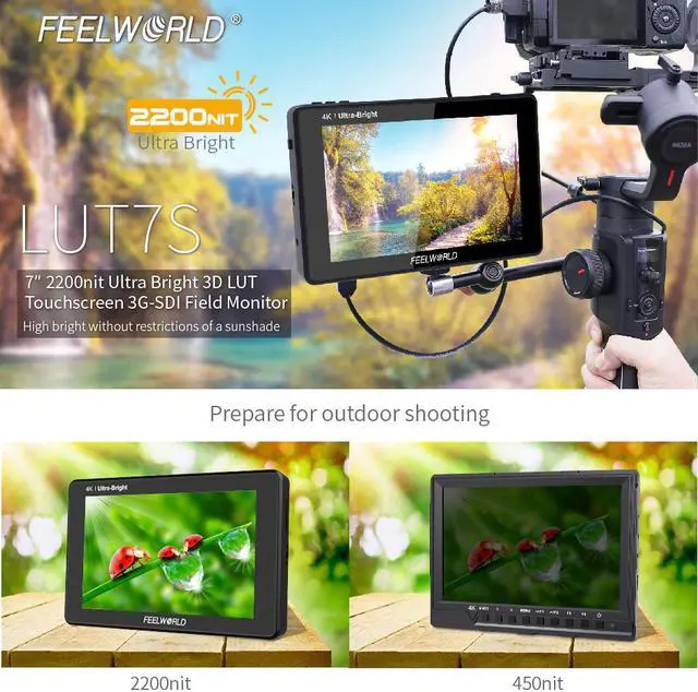 The 7" 1920 x 1200 monitor not only has the resolution and pixel density to make every shot look amazing, the high bright 2200nit screen at almost 4 times the brightness of conventional field monitors lets you shoot outdoors without reflections washing out your image. This makes it easy to see outdoors without a hood, making it easy for outdoor shooting in bright daylight!