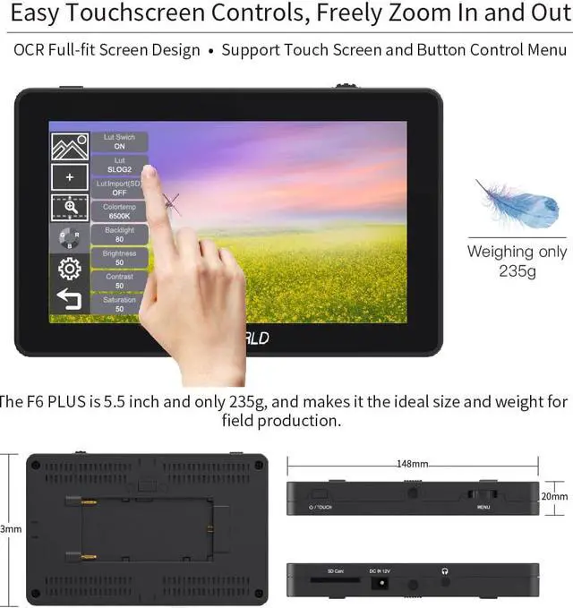 Newest Innovative Touch ScreenGet rid of complicated Buttons! All of the functions are at your fingertips. Its touchscreen allows you to zoom your image freely with a pinch gesture and access the menu settings conveniently.Custom 3D LUT SupportThe LUT loading function makes the color calibration easier and more intuitive, helps you optimize the work-flow efficiently. You can upload 3D LUT cube to F6 Plus via SD card.Ideal Camera PartnerEfficient DC output design. With a dummy battery(Optional), it can power your DSLR or mirrorless camera at any time, extend the run-time of your camera, while provide a more usable display.Flexible Dual-purpose Battery PlateBuilt-in two-in-one battery plate, compatible with Sony F Series and Canon LP-E6 batteries, providing long-time working condition. You dont need to buy battery plates separately. (Note: There are no batteries included.)Support 4K Format4K UHD 3840x2160p (30/29.97/25/24/23.98Hz), 4096x2160p (24Hz). And the output can be transmitted to broadcast monitor then you can monitor them at the same time.