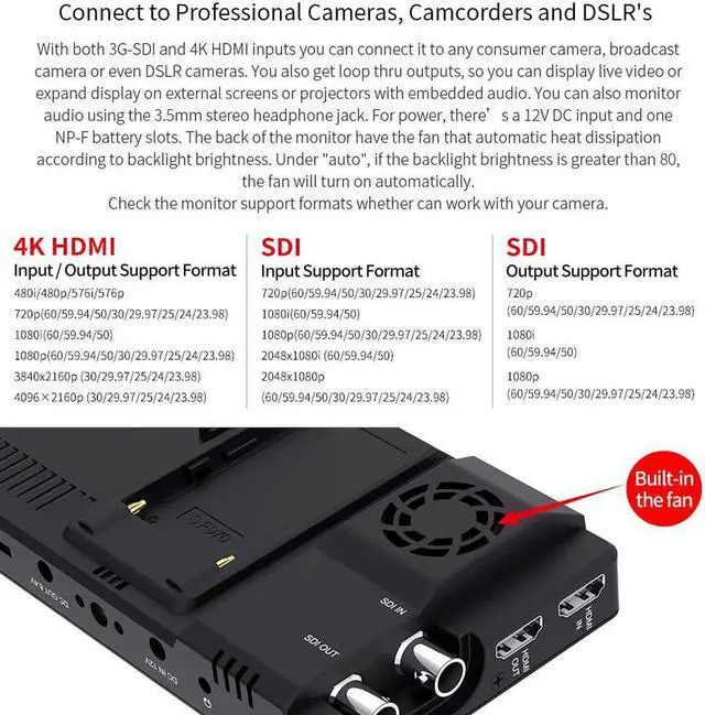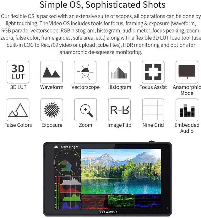 2600nit Super Bright, Visible in SunlightThe fully adjustable 2600nits screen is incredibly bright, making it perfect for shooting indoors or out. The high bright 2600nits screen is at almost 5 times the brightness of conventional field monitors, lets you shoot outdoors without reflections washing out your image. This makes it easy to see outdoors without a hood, making it easy for outdoor shooting in bright daylight!