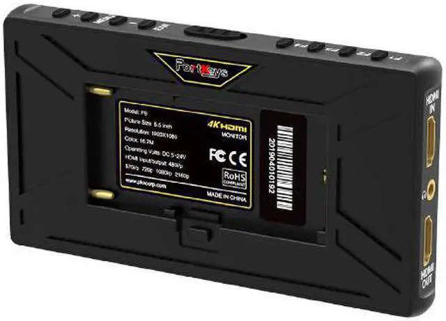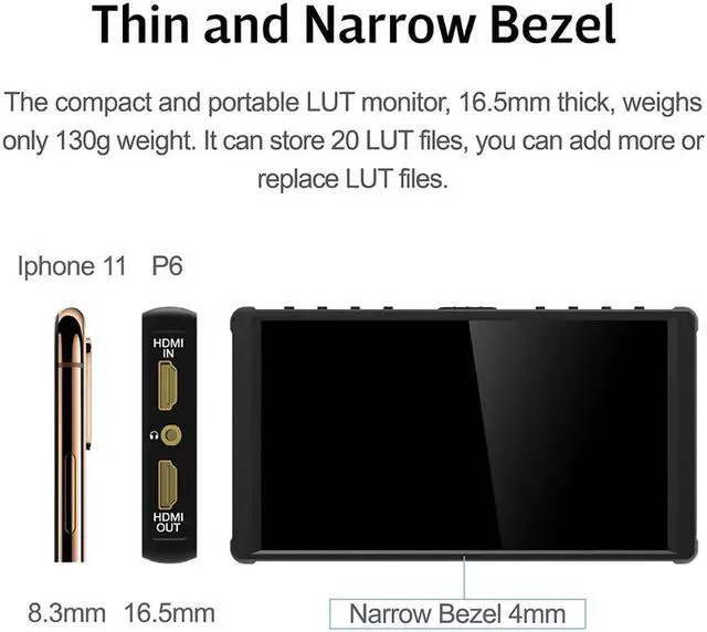 Screen Size: 5.5'' Dimensions:142x78x16.5mm Viewing Angle:160°H/160°V Brightness(nit):500nit Resolution:1920x1080 Contrast Ratio:1000:1 Weight:130g Color Depth:8bit Backlight:WLED Material:ABS Engineering Plastics Input Voltage:DC 7.4V Operating Power:6W