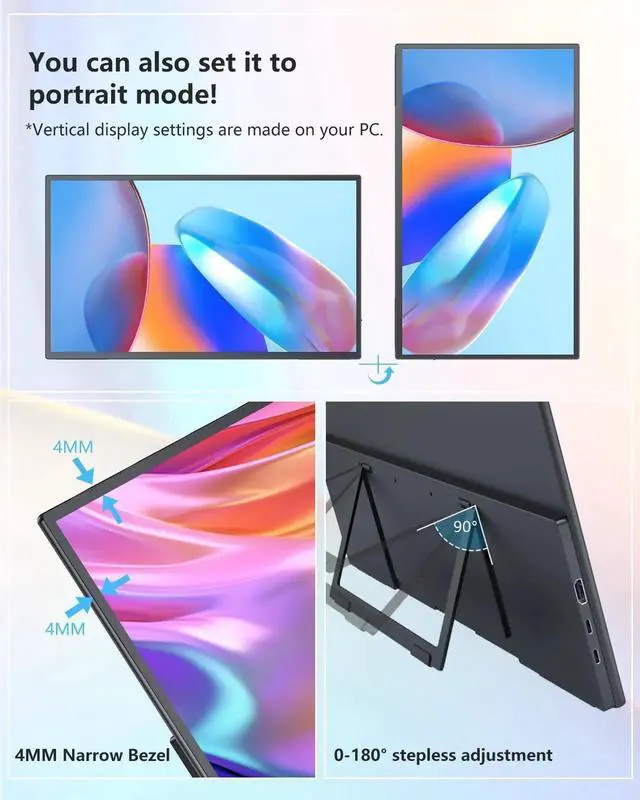 Adjustable Stand and VESA Compatibility: Using a portable monitor with stand, can customize your viewing angle with the adjustable stand, allowing for a comfortable setup whether you're working or watching videos. Plus, VESA(M4*5mm) compatibility lets you mount the monitor easily on walls or adjustable arms for enhanced flexibility.