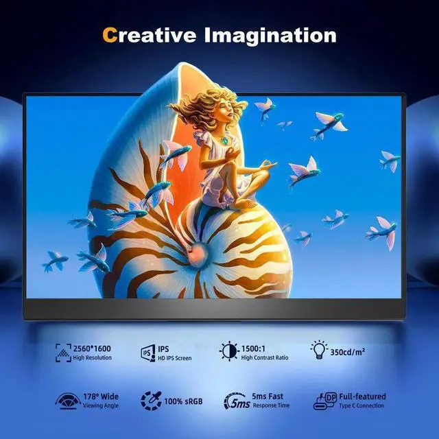 QHD 2K Portable MonitorA 2560x1600 resolution 2K monitor means that images and videos will be displayed with greater clarity and detail, with 100% sRGB can provide a high-quality, color-accurate display.