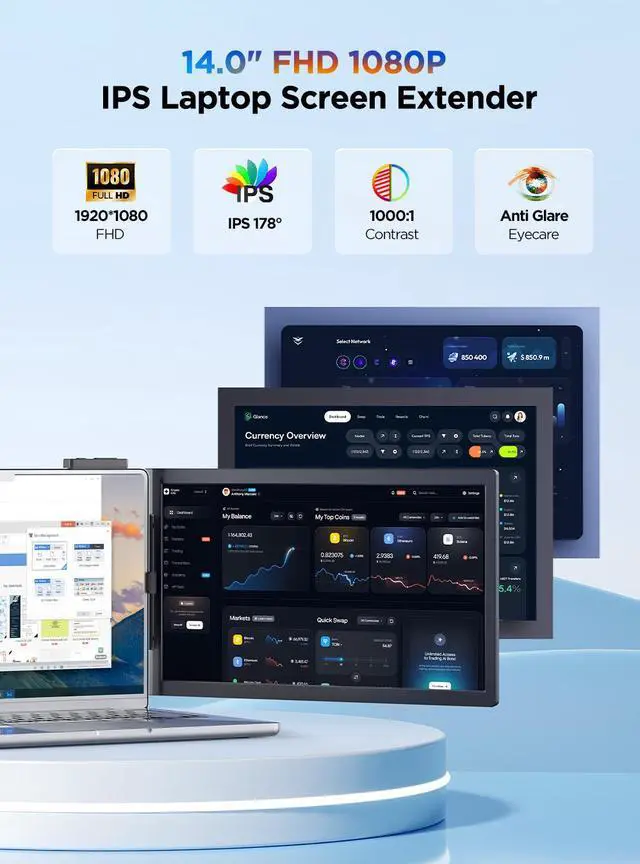 Dual 14" FHD IPS Screens with 250° Rotation: Two 14" IPS displays deliver 1920x1080 resolution, 300 nits brightness, 1000:1 contrast ratio, and 100% sRGB for vivid, color-accurate visuals. The attachable screen rotates up to 250°, letting you find the perfect viewing angle.
