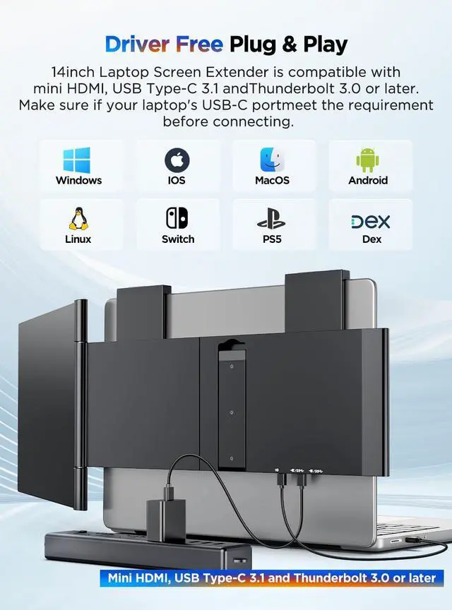 Plug-and-Play Triple Display USB-C/HDMI & Miracast: Connect via a single USB-C or HDMI cable (no driver or app needed) or wirelessly with Miracast. Compatible with Windows, macOS, Chrome OS, Android, and Linux. Instantly expand your laptop to three screens for real-time multitasking.