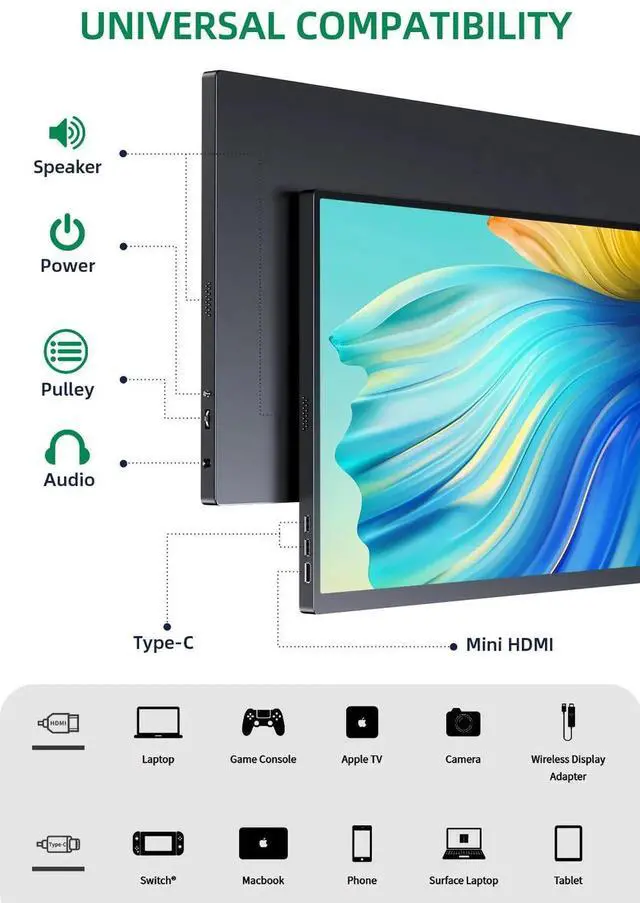 Wide Compatibility & Plug And PlayWith full-function Type-C ports and a Mini HDMI port, the portable gaming monitor works with multiple devices like laptops, PCS, phones, gaming consoles, PS4, PS5, XBOX, Nintendo Switch, Raspberry Pi, and more. Equipped with a 3.5mm audio input for an enhanced entertainment experience while watching videos and playing games.
