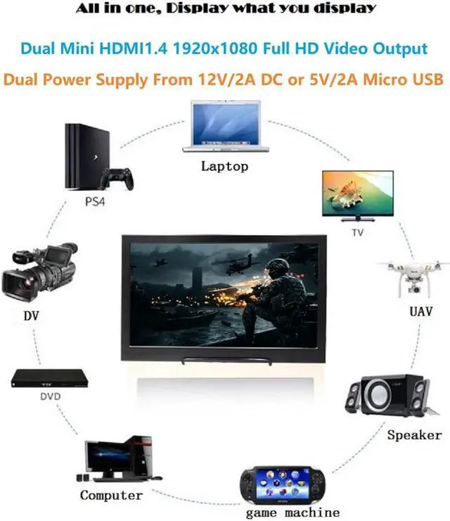 - Mini HDMI: Support Full HD Video Display, Music and Picture Play, Compatible with 1080P / 720P, Connect to Computer / Laptop / PS4 / Switch / XBOX / FPV / Model airplane / Industrial and Medical Video Equipment / Vehicle video device etc.