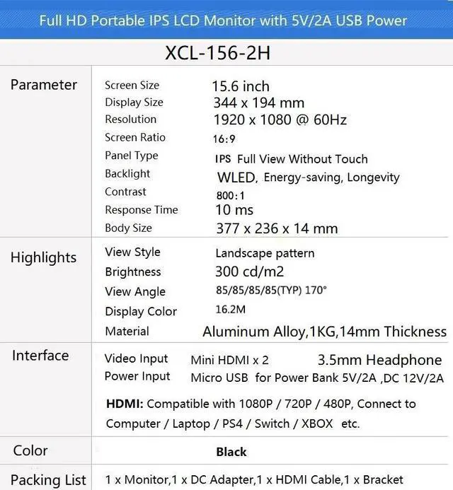 - 15.6 inch Universal Portable Monitor, Brand IPS LCD Screen, industrial quality, Support High Dynamic Range Imaging (HDR), Better picture quality, Applied to Various Terminal Display, Such as Game consoles, PS3/4, XBOX360, Switch, Car Video, Car Headrest, Industrial and Medical Display etc..