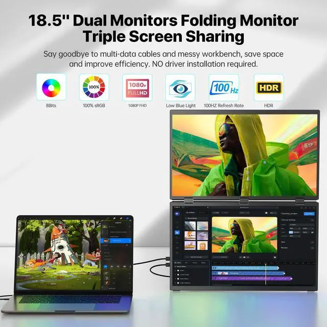 The world's first driver-free dual-screen portable monitor with touch functionality. Connect via a single Type-C cable and enjoy seamless dual-screen display without the hassle of installing drivers.
