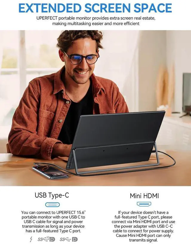 • Versatile Connectivity: Features HDMI, USB-C, and USB-A ports for seamless connection to laptops, smartphones, and other devices.