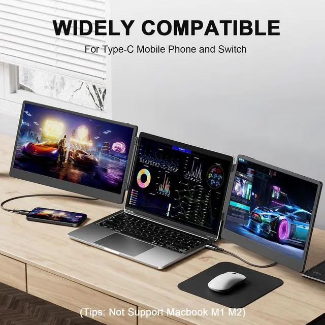·[High Compatibility] The Laptomo laptop mobile monitor extender is plug-and-play, requiring no driver downloads. Each screen can fold from 0 to 180 degrees and is compatible with most operating systems, such as Apple, PC, Windows, Android, PS5, etc.