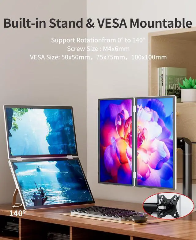 [Ergonomic and User-Friendly Design]: The Laptomo stacked folding monitor is designed to reduce strain on your eyes and neck, aligning naturally with ergonomic standards. The adjustable stand and VESA mount cause the screens to stack vertically or horizontally, providing maximum comfort and flexibility in your workspace setup.