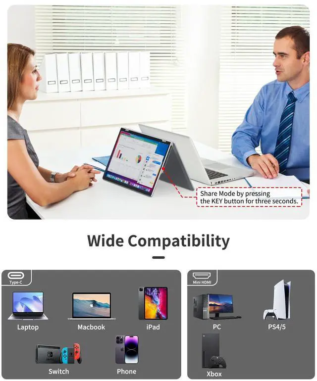 [Efficient Workflow]: This portable monitor, with its 340-degree rotation, is capable of enhancing productivity by allowing multiple viewing angles. Whether used for team collaborations or client presentations, simply mirror your screen for effortless sharing from any perspective.