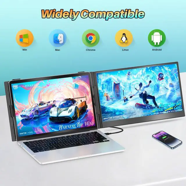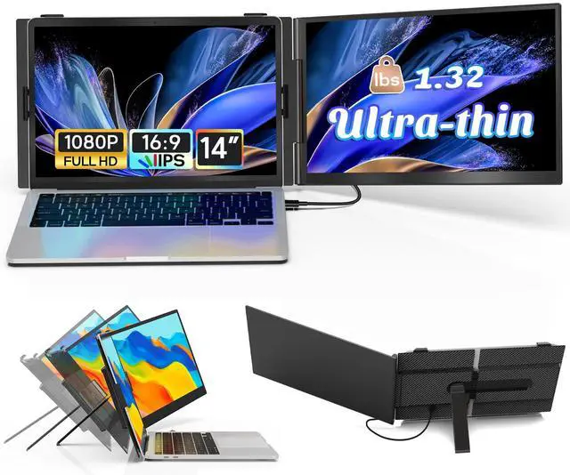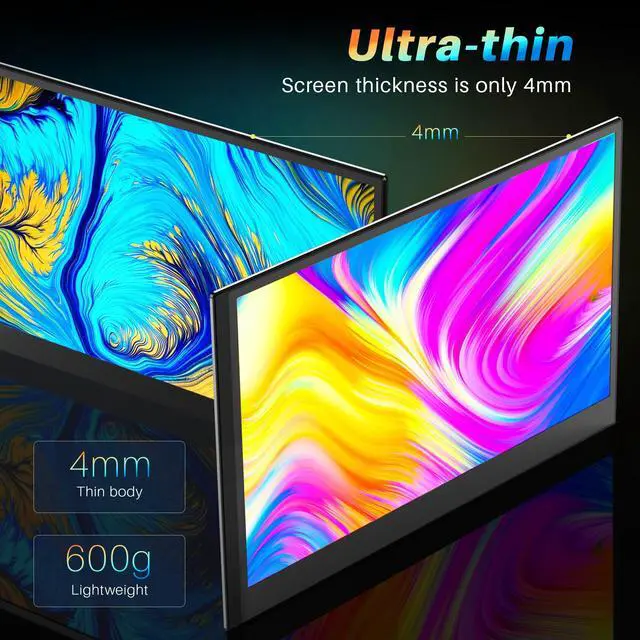 Ultra-Slim & Ultra-LightThe ultra-thin dual laptop screen extender is only 4 mm thick and weighs just 600 g, and comes with a free storage bag for added convenience when traveling. FHD IPS 1080P resolution, 100% sRGB color gamut ensures that every color is rendered with lifelike accuracy, The laptop monitor extender can independently adjust the brightness, stereo speakers, contrast and other parameters.