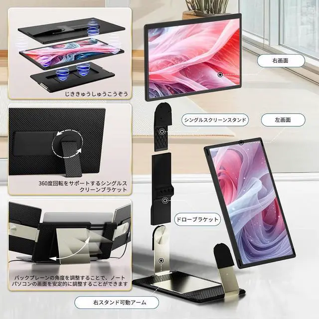 [Dual screens can rotate and be detached]. The dual screens can horizontally rotate 235° and vertically rotate 90°, allowing for more than a dozen unique configurations.