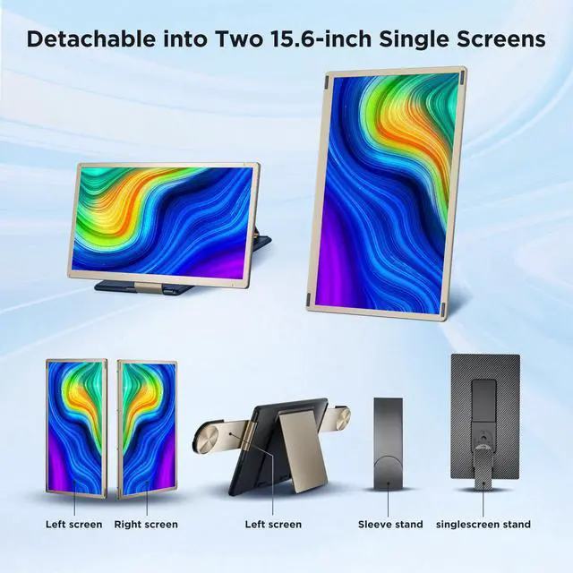 [11 Flexible Display Combinations]: Both detachable screens support 90° vertical rotation and 235° horizontal adjustment. Paired with the sleeve stand and single-screen bracket, you can arrange up to 11 different setups. The magnetic design ensures stability, and the whole unit folds compactly for storage in the included carry bag.