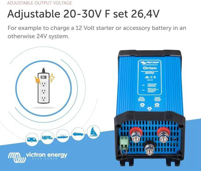 Victron Energy Orion Non-Isolated DC-DC Converter converts voltage from DC 12-Volt (9-Volt - 18-Volt) to DC 24-Volt (20-Volt - 30-Volt) with a 20 amp output and 93% high conversion efficiency.