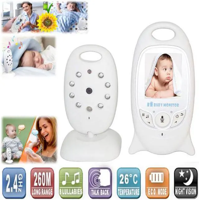 Features: 1. Hassle-Free Portable Monitoring 2. Two way (talk back) 3. Temperature monitoring 4. Built-in 8 lullabies in the camera 5. Automatic night vision 6. Secure, interference free, long range digital signal (up to 260m) 7. High contrast 2.0" color LCD monitor 8. Long battery life (8 hours in Vox mode).