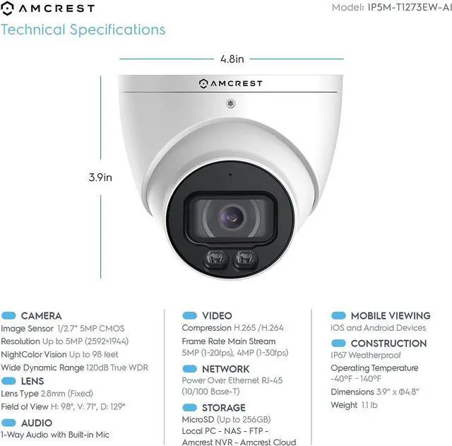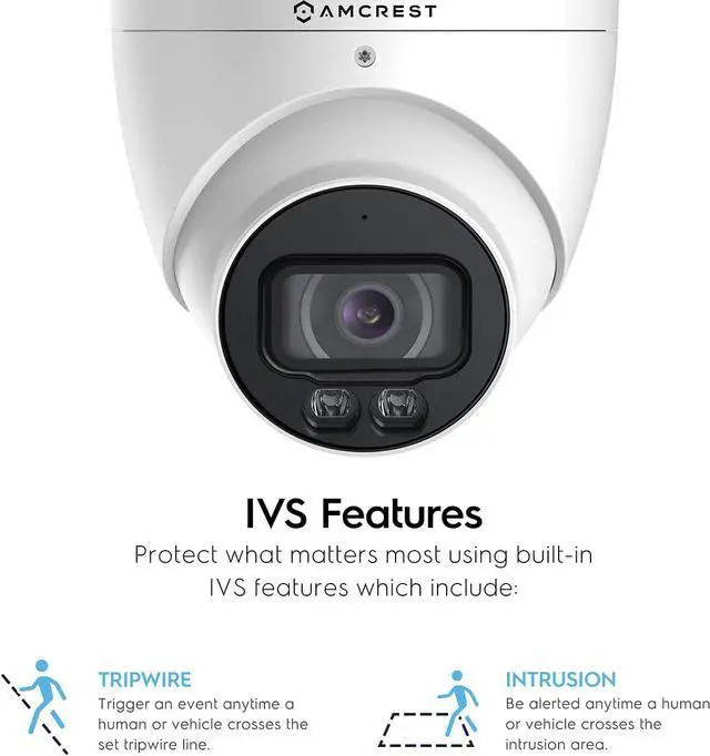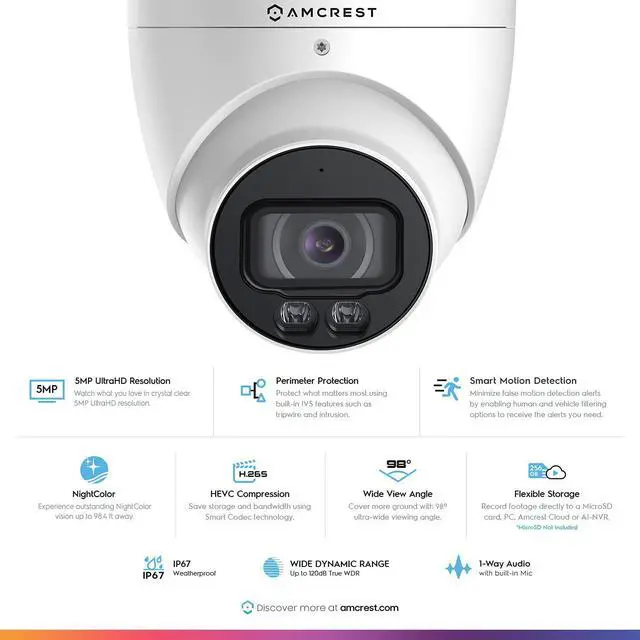 AI FEATURES – The Nightcolor Turret PoE AI Camera features Human & Vehicle Detection, and IVS Features (Tripwire, Intrusion). 5-Megapixel @20fps video with a super-wide 98° viewing angle. PoE injector or switch required; not included, sold separately. SMARTER SECURITY – Receive motion alert notifications and review footage via your smartphone with the Amcrest View app. Playback and record professionally on a PC using the Amcrest Surveillance Pro software for Windows and MAC (included) or Blue Iris Professional. Works with Amcrest Cloud remote video storage, Amcrest NVRs, Synology and QNAP NAS, FTP, SeaMonkey, and Pale Moon Browsers, IE, Safari, Firefox 49.0 and Chrome with Amcrest Web View Extension.