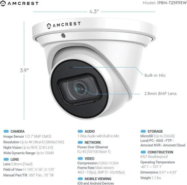 High Resolution 8-Megapixel Ultra High Definition Video for Excellent Quality and Clarity, 4K @15fps, 3MP @30fps