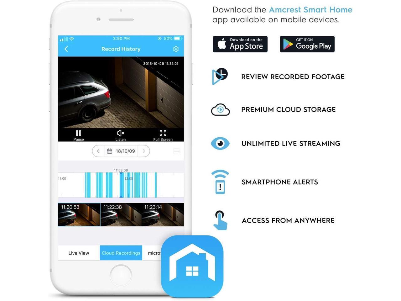 SMARTER SECURITY Receive motion alert notifications and review footage via your smartphone with the Amcrest Smart Home app. Securely store your HD footage to the Amcrest Smart Home Cloud or store directly to a class 10 MicroSD card up to 256GB for continuous recording. (Limited compatibility with Amcrest View Pro, not compatible with Amcrest Cloud).