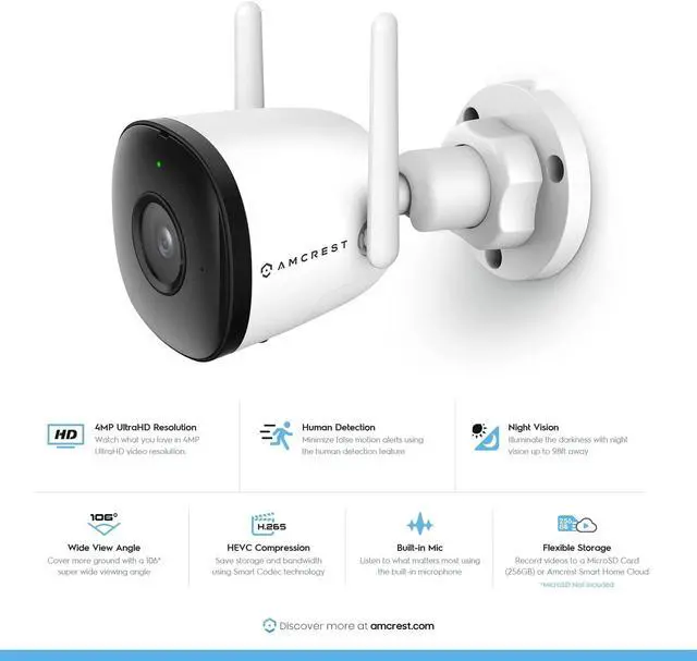 Extra-Wide 106° viewing angle with 16x Digital Zoom Night Vision up to 98 feet with built-in IR LED and 1/ 2.7 4MP image sensor. Built in Microphone so you can listen. 2.8 mm Lens with 1 IR LED Night Vision Up to 98 feet. This Camera Needs to be Connected to a Power Source in Order for it to be Powered.