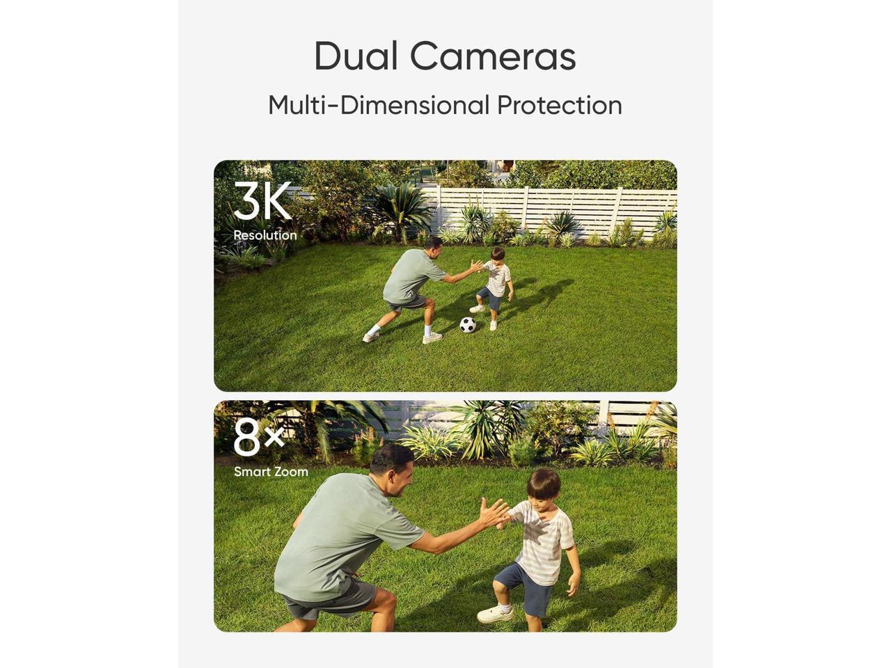 - Double the Cameras, Double the Possibilities: The 2K telephoto camera captures details from up to 50 ft (15 m) away, while the 3K wide-angle camera focuses on the big picture. Dual cameras provide 8× hybrid zoom and up to 3K resolution. Note: The max resolution will be 2K when using AI Tracking or Dual Views.