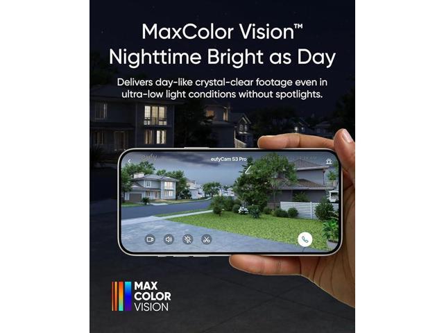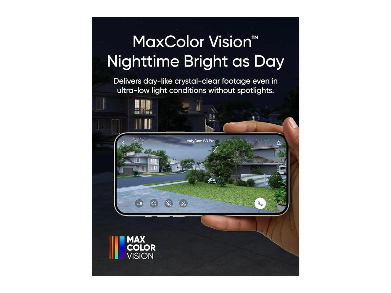 - Nighttime That's as Bright as Day: Harness the power of a 4K camera combined with MaxColor Vision technology. eufyCam S3 Pro captures exceptionally detailed surveillance footage in every frame, offering day-like image clarity even in ultra-low light conditions without the need for a spotlight.