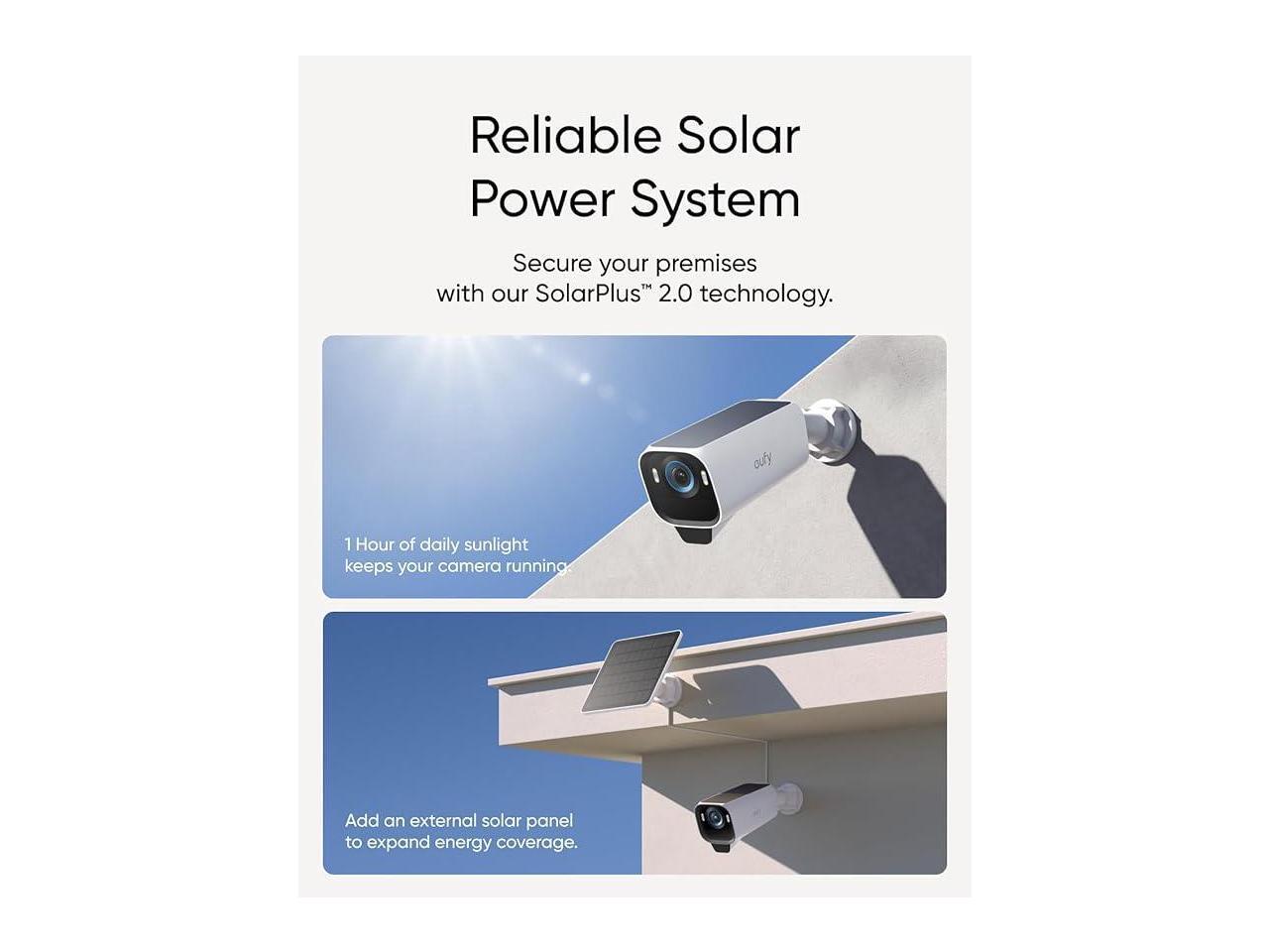 - Reliable Solar Power System: Experience peace of mind year-round with continuous, reliable security powered by SolarPlus 2.0 technology. Choose the built-in panel for streamlined efficiency or add an external panel to expand energy coverage. This system offers versatile mounting options and reliable backup power for continuous security.(includes 2 backup solar panel).