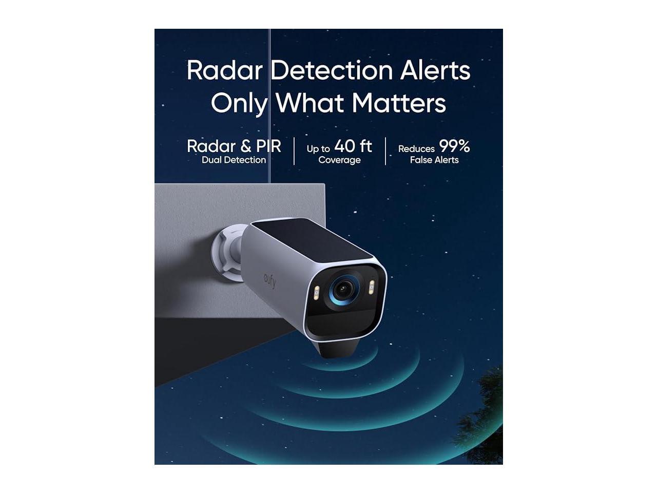 - Radar-Powered Detection Alerts Only What Matters: The dual motion detection system, combining radar and passive infrared (PIR), accurately identifies human movement and reduces false alerts by 99%, guaranteeing that alerts are only triggered by major security events in specified areas.