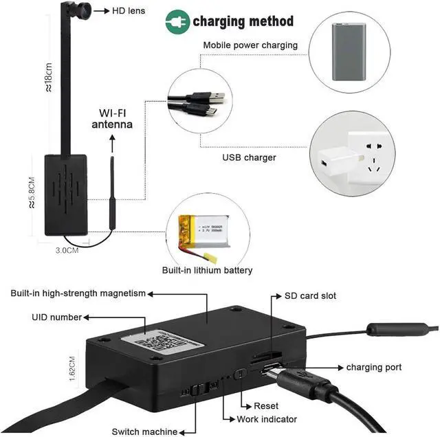 ?[Ultra-compact invisible camera] has 2 different wide-angle DIY lenses. Convenient to carry and easy to modify. Suitable for mobile APP (available for both IOS and Android) PC multi-terminal operation, you can download the application on your smartphone/tablet for real-time monitoring. This WiFi camera is only available on 2.4Ghz WiFi and does not support 5Ghz WiFi. Please charge before use.