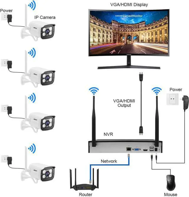 Auto-Pair&Plug-PlayNVR with built-in WiFi router. Within the system, NVR and cameras communicate automatically and wireless. You just need to plug the network cable, nvr power cable and mouse cable into the NVR box, connect the mouse to the NVR. Connect the PC/ TV monitor to the NVR with a VGA/HDMI cable. They will AUTO-PAIR and give you view of 4 cameras immediately. Cameras and NVR are paired before shipping. This is really hassle-free plug&play.