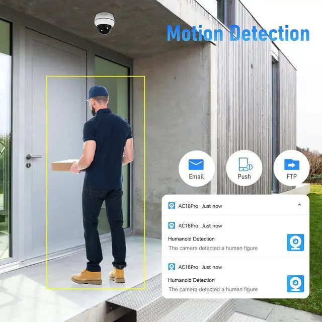 Person/Vehicle Detection and Auto TrackingThis 4K PTZ camera supports human/vehicle detection and auto tracking functions, which can better protect the safety of your property. When someone approaches your home, your mobile phone will receive an alert push, and the snapshot will be sent to your FTP server and mailbox, and you will not miss every detail.