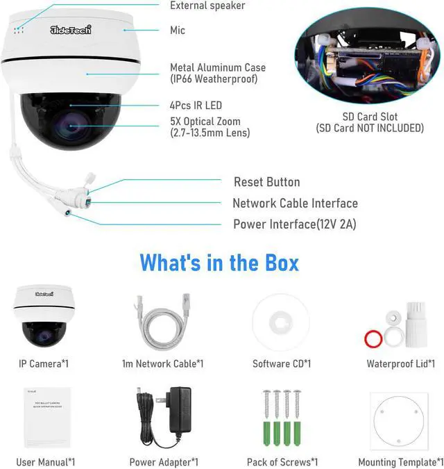 Built-in 2-way audio and SD card slotBuilt-in microphone and speaker, G. 711A codec standard anti-noise technology ensures clearer voice. No matter where you are, you can easily chat with your family, support up to 256G SD card (not included), and realize 7/24 hours of recording storage.
