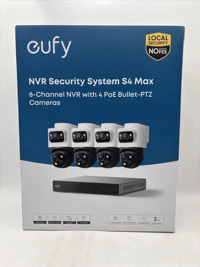 Protect your home or business with the eufy PoE NVR Security System S4 Max, a professional-grade surveillance solution designed for ultimate coverage and reliability. This complete 8-channel system includes 4 PoE bullet and PTZ cameras, providing crystal-clear 4K UHD resolution to capture every detail, day or night.