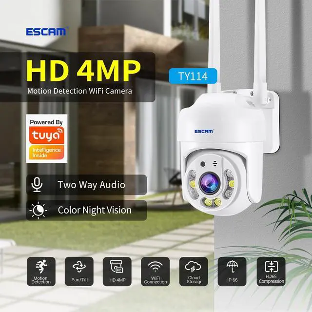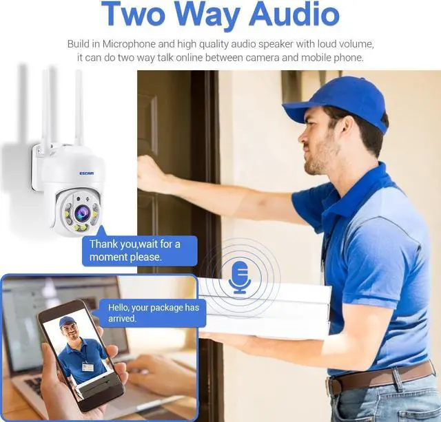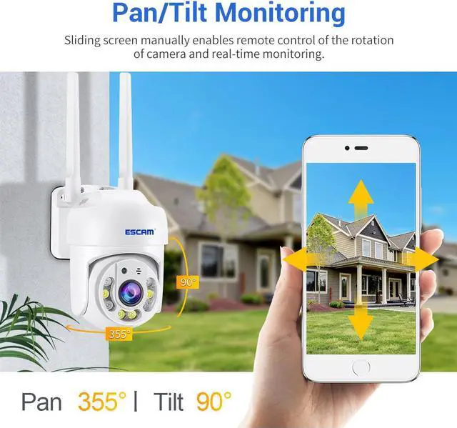4MP 355°Pan & 90°Tilt WiFi IP camera 2-Way Talk This is HD 4MP (2560*1440) wifi outdoor camera, 355°horizontal and 90° vertical rotation range covers a larger visual range, 4mp allows you to see more details of distant objects without damage Image quality, This ip camera built-in mic and speaker. You can talk with the visitors or your family on smart device in anywhere anywhen.