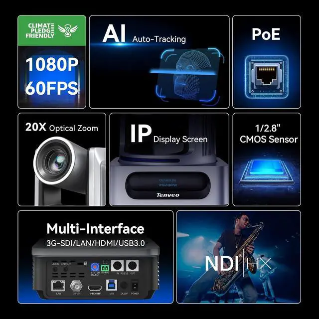 Tenveo NDI PTZ Camera, AI Humanoid & Face Auto-Tracking, 20X Optical Zoom, 3G-SDI/HDMI/USB3.0/LAN(PoE) Live Streaming with Tally Light & IP Display, for Live Streaming Video Production Church Worship