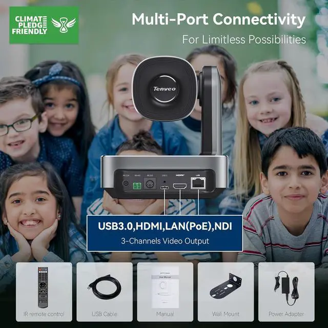 & The 4K NDI PTZ Live Streaming Camera offers exceptional flexibility with HDMI, USB 3.0, and RJ45 outputs. Supports PoE, allowing a single Ethernet cable to handle both power and data. It simultaneously outputs up to 4K@30fps video from HDMI and USB3.0, and up to 1080p from IP and NDI streams. Perfectly compatibility with professional Video Mixer Switchers and the Tenveo PTZ Controller. : NO buit-in micphone.