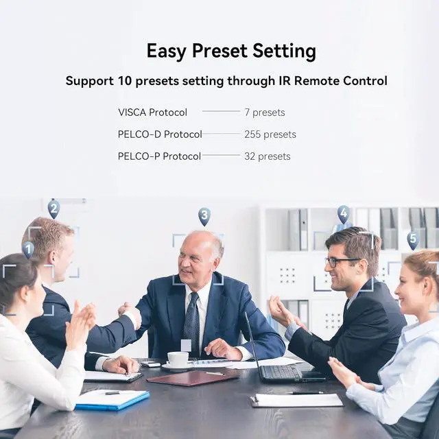 / Tenveo PTZ Conference Camera can be controlled remotely to rotate 350° (±175°) horizontally and 180°(±90°) vertically in an accurate, smooth and silent way. It is also supportive of 10 presets setting through the IR Remote Control and is available to set up to 255 presets via RS232 and RS485 interfaces for professional control. The convenient way could quickly control the PTZ camera pan, tilt, zoom, and move to the preset position for close-up sequence.