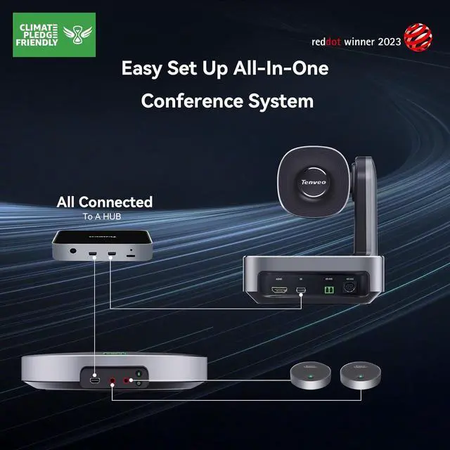 Elevate your meeting with Tenveo conference room camera and microphone. This 4k conference room camera system features a DSP audio processor, high-fidelity speaker, intelligent noise reduction, and automatic echo cancellation for crystal-clear voice capture. With its omnidirectional pickup pattern and two included expansion microphones, it offers an impressive 33ft (10m) voice pickup range, ideal for large conference rooms (40-100 sqm, 10-25 participants).