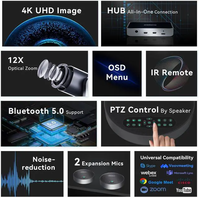 -- & Get started instantly! Our All-in-One video and audio conferencing system is plug-and-play, designed for effortless setup and operation. The 4K PTZ Conference Room Camera and Microphone is compatible with multiple devices through HDMI,RS485,RS232 interfaces. It ensures seamless compatibility with leading platforms like Zoom, Teams, Webex, Skype for Business, Voovmeeting, and CISCO WebEx. Supports Windows 7/8.1/10 and Mac OS X 10.7 or higher, making every meeting easier.