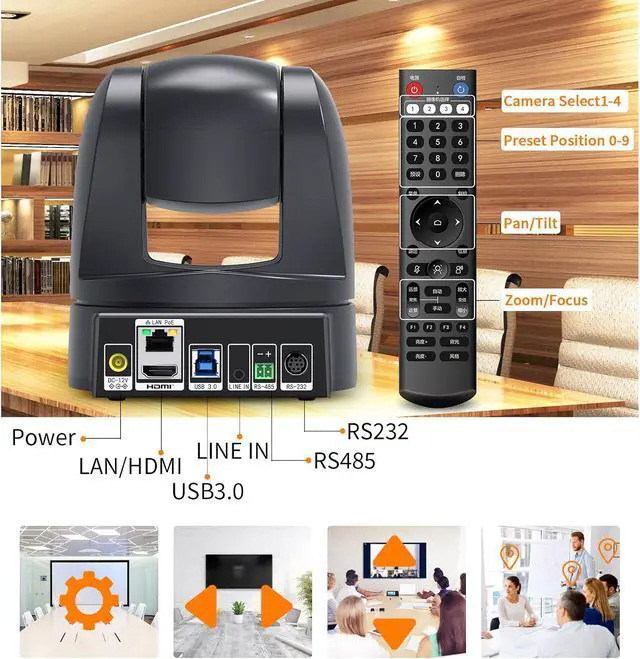 Easy to Control and Setup20x optical zoom, maximum horizontal field of view up to 58.7° without distortion.Rotates 350° (±175°) horizontally and 120° (-30° to +90°) vertically. The video conference camera can set up to 255 presets via USB cable or joystick, RS485 or RS232 (10 presets can be set via the IR remote control). Easily move to preset positions for close-up shots. Supports Visca and Pelco P/D control protocols.