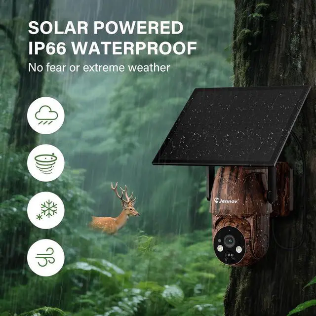 Solar-Powered & Weatherproof DesignThis Jennov trail camera features a high-efficiency 6W solar panel and powerful rechargeable battery, delivering uninterrupted power for year-round operation (365+ days without charging).