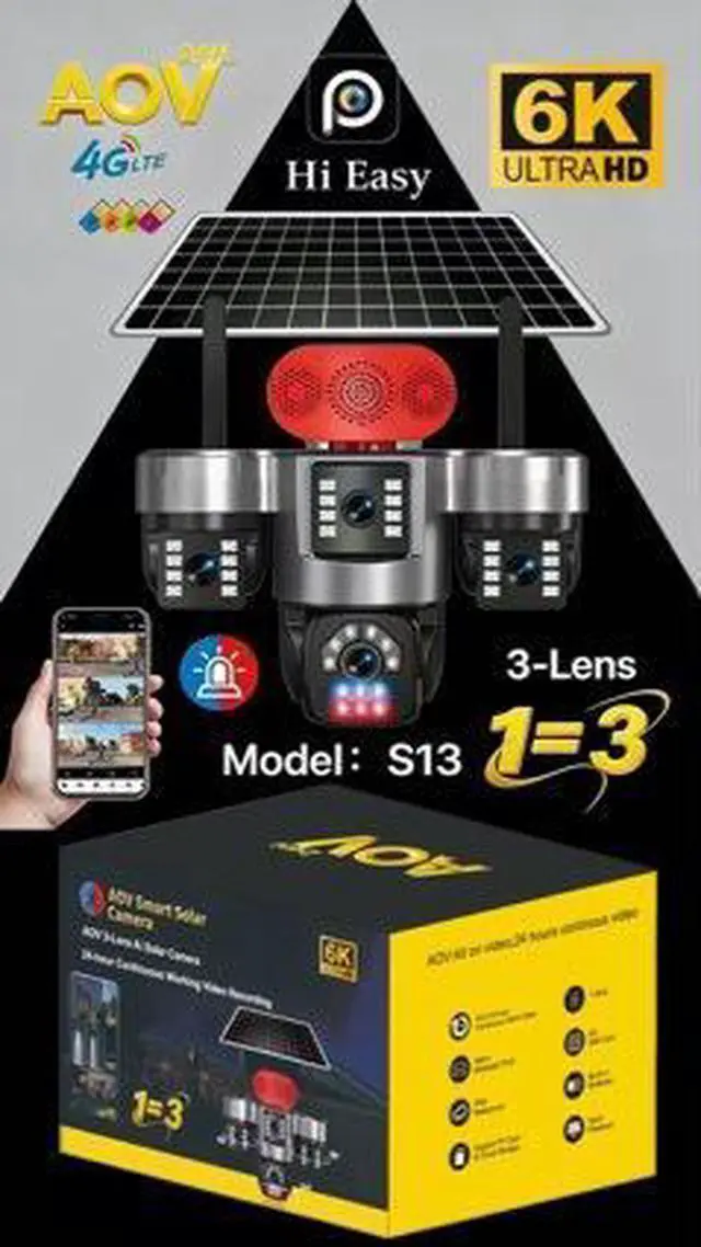 Secure large properties with the AOV Solar 3-Lens 4G Security Camera. Featuring triple-lens coverage, 1080P HD video, and 4G cellular connectivity, this solar-powered outdoor camera delivers comprehensive surveillance for farms, parking lots, and remote locationsno WiFi or power needed.