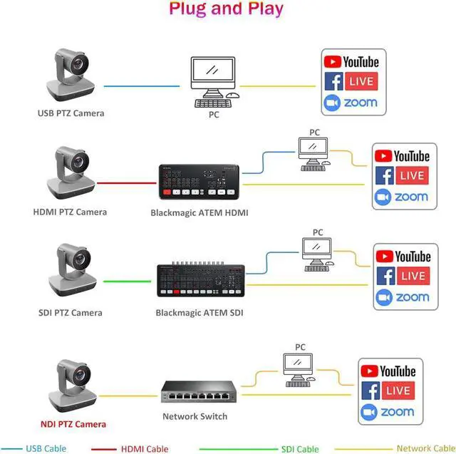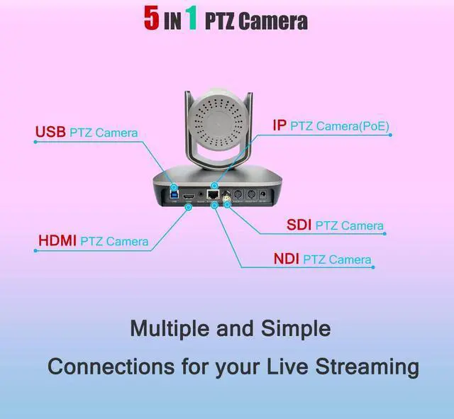 HDMI SDI PTZ Camera. HDMI/SDI Video Output that is compatible well with most HDMI/SDI switcher and Capture cards like ATEM Mini, Magewell, Camlink, Elago... You can find the best solution to install your video system with best investment.