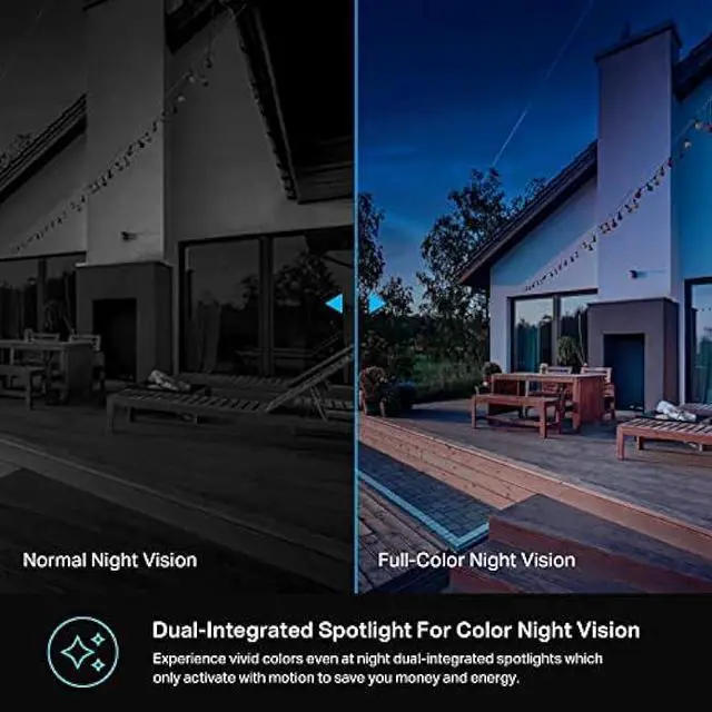 Starlight Sensor & Night Vision: With Starlight Sensor, images in low-light conditions will still appear crisp and high resolution. Determine if its just an animal rustling behind a bush or who that shady figure is across the street. Dual-integrated spotlights for colored night vision, to 98 ft.