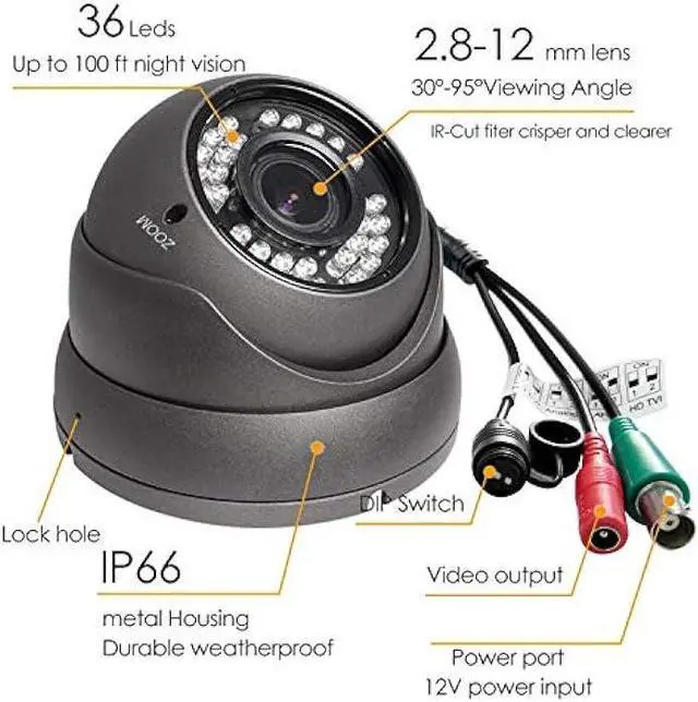 2.8 ~12mm Manual Focus/Zoom Varifocal lens, 36 Powerful IR LEDs for Night Vision up to 100ft.