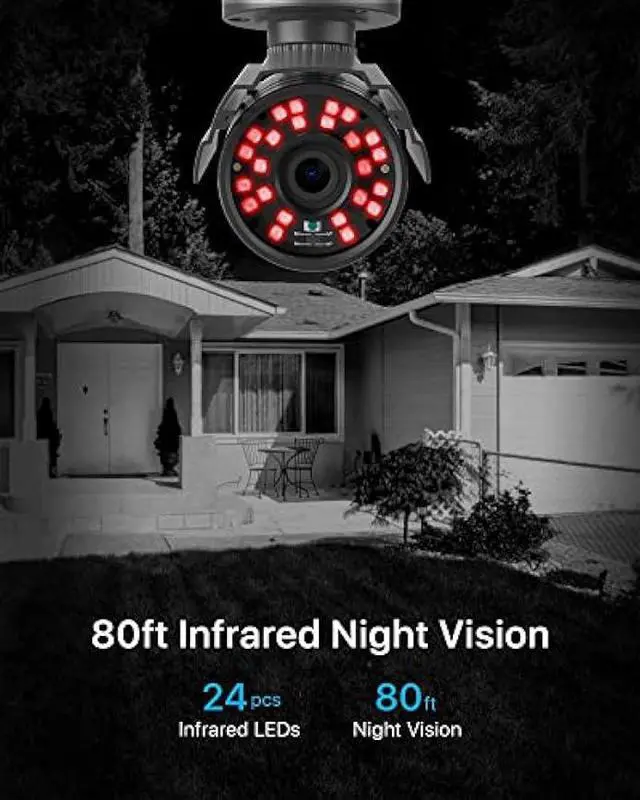 80ft Night VisionBuilt in 24pcs IR LEDs, Get a sharp and crisp image day or night with the camera's automatic IR-CUT filter. Up to 80ft night vision in total darkness and 120ft Night vision in ambient light. More than 3.0L ux the night vision is color.