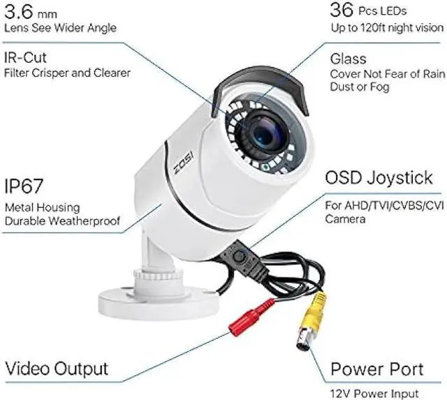 120ft Night Vision Built in 36pcs IR LEDs, Get a sharp and crisp image day or night with the camera's automatic IR-CUT filter. Up to 120ft night vision in total darkness and 160ft Night vision in ambient light. More than 3.0L ux the night vision is color.