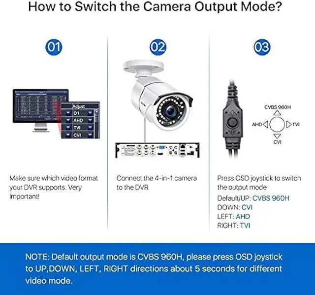 Bulit in OSD Menu-- It comes with OSD Menu which can change 4 different video output. 1080P AHD, 1080P CVI, 1080P TVI and 960H CVBS. Default Video mode is 960H mode, compatible with all analog DVRs.